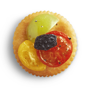 リッツに1のカラフルプチトマトを4等分してのせ、レーズンをのせる。