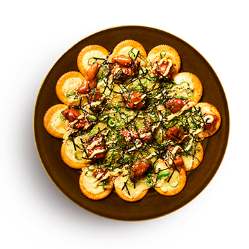 刻み海苔を散らし、チーズが溶けるまで4〜5分焼く。仕上げに白いりごまをかける。