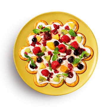 並べたリッツクラッカーにギリシャヨーグルトを塗り、お好みの冷凍フルーツをのせる。
