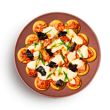 並べたリッツクラッカーにキムチをのせ、薄く切ったモッツァレラチーズをのせる。