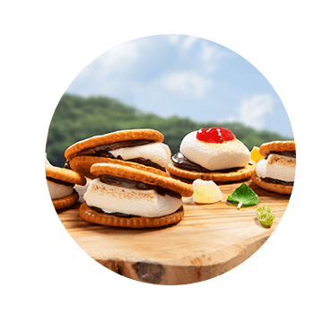 マシュマロを、ほんのり焦げ目がつくまで炭火で焼き、1にはさむ。