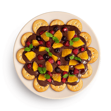 1にチョコレートを回しかけ、オレンジと冷凍ベリーミックスをのせる。
