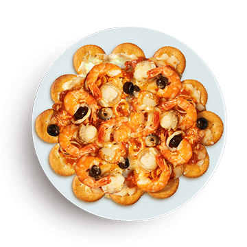 エビ、ヤリイカ、ミニ帆立、ブラックオリーブを散らすように盛る。