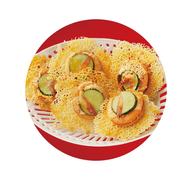天板にリッツ チーズサンドを並べる。各リッツの上に1のズッキーニ、干し桜エビ、ピザ用チーズをかける。