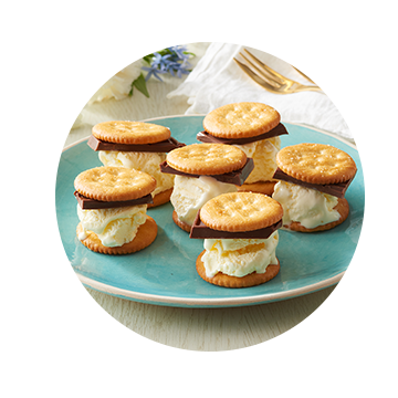 リッツ クラッカーにバニラアイスと板チョコレートをのせて、さらにリッツ クラッカーをのせサンドします。