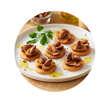 1とアーモンドをリッツ クラッカーにのせ、オリーブオイルとブラックペッパーをふります。