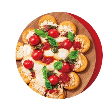 溶けるチーズを中央に敷きつめ、その上にミニモッツァレラ、ミニトマトを並べる。その上に、ピザソース、バジルペーストをのせる。
